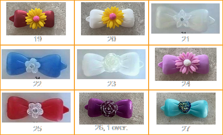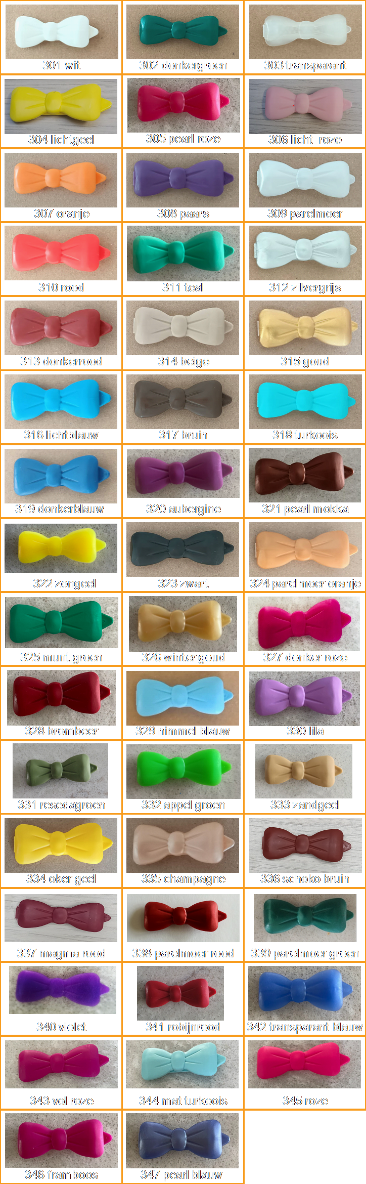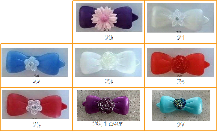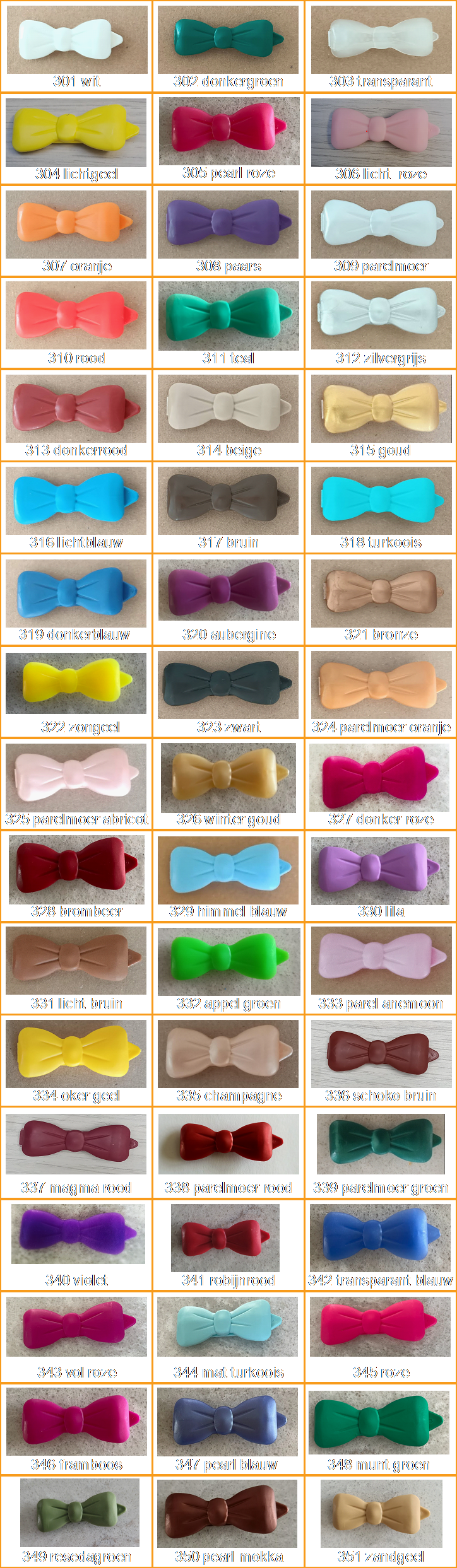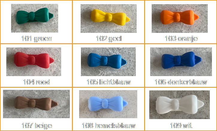 | Strikjes (groot, klein) | Strikjes met versiering (groot, klein). | Speldjes (recht, botjes) |